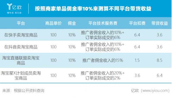 根据亿欧此前的测算,当前在淘宝直播平台上带淘宝天猫的商品,主播/商家能获得的收益是最高的,很多时候甚至是抖音快手平台的近2倍。