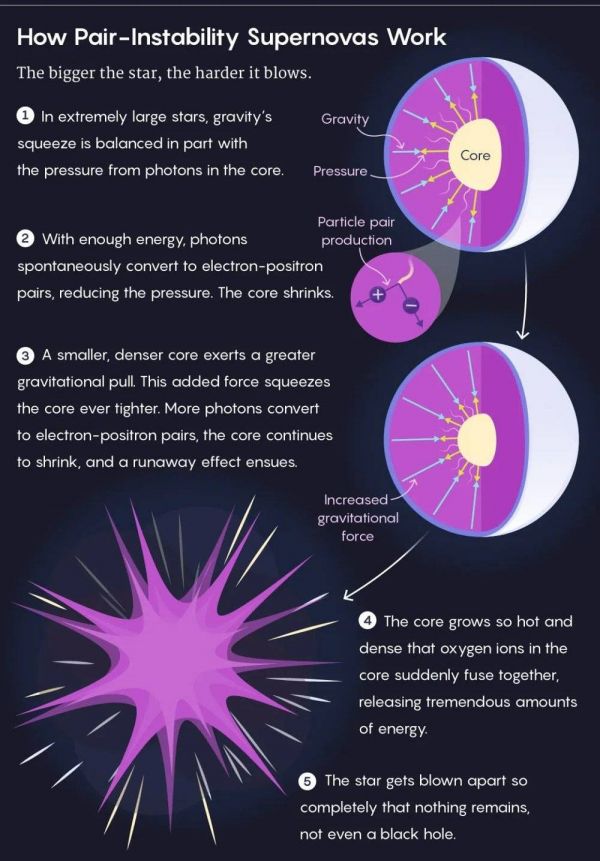 早在上世纪60年代初,著名的英国天文学家霍伊尔(Fred Hoyle)和美国核物理学家威廉·福勒(William Fowler,福勒与钱德拉塞卡共享1983年诺贝尔物理学奖)提出如果超大质量恒星(质量可高达1亿倍太阳质量)内部温度高到一定程度,其电磁辐射场中的高能γ光子可以转化生成正负电子对(electron-positron pair),因而高能γ光子数目锐减,导致光子气体所产生的辐射压降低,不足以抵抗向内的强大引力,超大质量恒星的内核就变得不稳定了,也就是所谓的PI。补充说一句,时至今日人们依然在寻找超大质量恒星的证据。