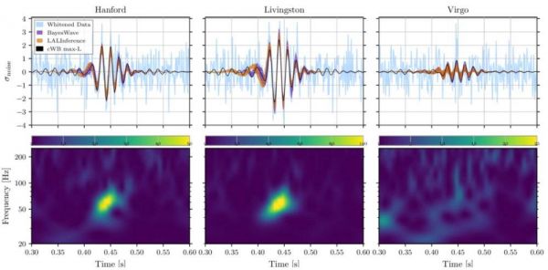 那么究竟是否是引力波信号呢?LIGO-Virgo合作团队有两类算法来识别信号,一种是在数据中挑选出特定的模型双星并合信号,依靠设计好的双黑洞或中子星等天体运动的模型作为模板,而且为了相互验证,这类算法中是两种不同的工具(PyCBC和GstLAL);另一种是更“万能”(coherent WaveBurst,简称“cWB”),针对各种突发信号,错误率仅为4900年一次,最早发现的引力波信号就是通过这种算法发现的。三种算法都发现了本次事件信号,在PRL的论文中,他们主要解释了算法识别的真实性,肯定了信号源于引力波,并且符合双黑洞并合模型,同时确定相关参数。