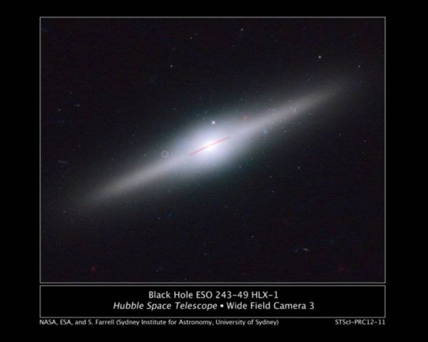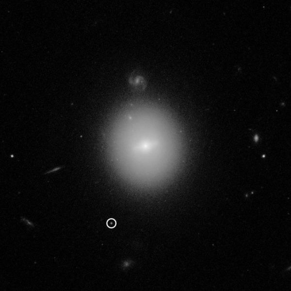 哈勃空间望远镜-宽视场望远镜3所摄。白色圆圈里面的蓝色小点即ESO 243-49,HLX-1所在位置丨图源:NASA/ESA
