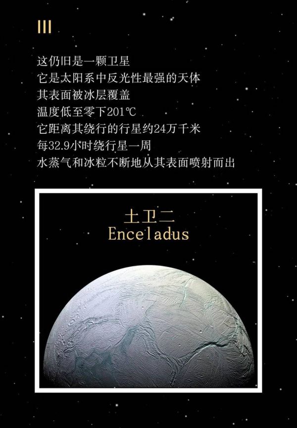 土卫二环绕土星运行,是土星的第六大卫星。以肉眼来看,土卫二就像是一颗明亮的白色雪球。它的北半球布满了撞击陨石坑,而南半球则有着许多“虎斑”裂缝。当科学家在其南极附近意外地发现了巨大的间歇性“喷泉”之后,他们开始第一次注意到,这颗卫星或许有生命存在。