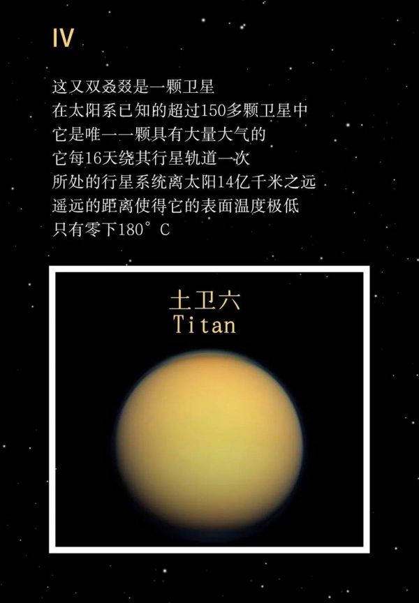 土卫六是土星最大的卫星,也是太阳系中唯一有大气的卫星。它的大气有着由复杂的有机分子构成的厚厚的橙色雾霾,以及被甲烷替代了水的天气系统。在这颗充满了碳氢化合物的星球上,有季节性地降雨和干旱时期,其表面之下还可能存在着一片液态海洋。