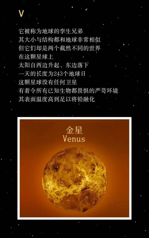 它略小于地球,其内部与地球非常相似。金星的表面具有陨石坑、火山、山脉和巨大的熔岩平原,这些特征都被厚厚的云层覆盖。金星的大气层又厚又热,它的大气主要由二氧化碳构成,厚厚的硫酸云覆盖了整颗星球,几乎没有已知的生命可以在这样的环境下存活下来。