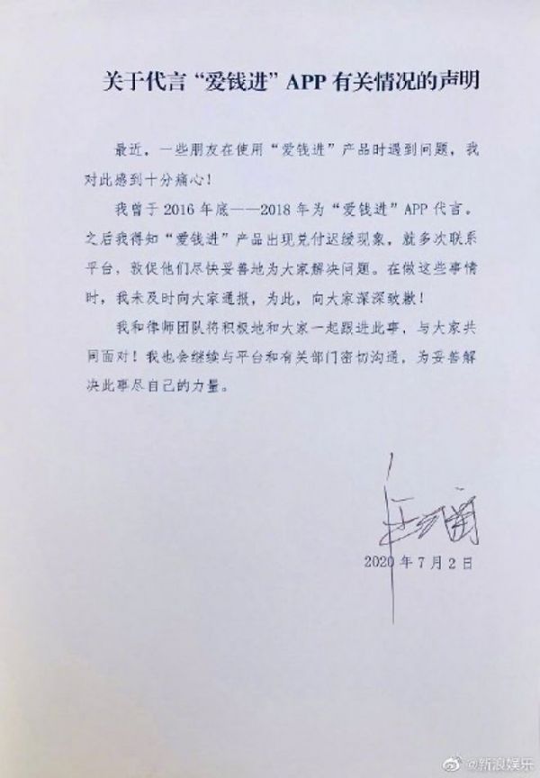 今年7月,被立案消息再度传出,“爱钱进”昔日代言人汪涵与刘国梁曾冲上微博热搜榜,对此,两人都在公开场合发声道歉。汪涵在第二天即发公告表示,自己曾于2016年至2018年为“爱钱进”APP 代言,之后得知产品出现兑付迟缓的现象,就已经多次联系平台敦促尽快为大家解决问题,之后,还将和律师团队积极地和大家一起跟进此事,共同面对,也将会和平台、有关部门密切沟通,为妥善解决此事尽力。