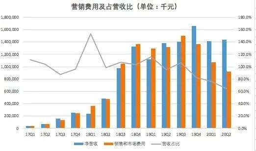 从市场和营销费用的营收占比来看,趣头条二季市场和营销费用的营收占比为64.2%,远远低于去年同期95.4%的营收占比。