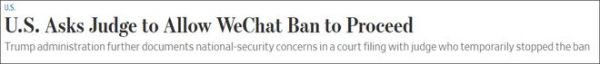 《华尔街日报》报道称,25日美司法部向法院递交文件,要求比勒暂停执行她在20日作出的初步裁决。文件中称,比勒的裁决“允许WeChat继续不受限制的使用。而特朗普政府认定这款移动应用对美国的国家安全和外交政策构成了威胁”。