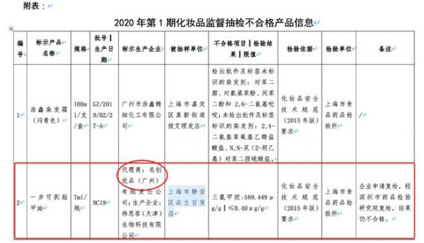 据上海药品监督管理局网站消息,9月23日该局发布了《2020年第1期化妆品监督抽检质量公告》。公告显示,名创优品(广州)有限责任公司代理的一款名为“一步可剥指甲油”的化妆品,检出三氯甲烷含量高达589.449μg/g,是国家标准限值0.40μg/g的1400多倍。上海药监局披露的信息显示,该企业申请复检,经深圳市药品检验研究院复检,结果仍不合格。