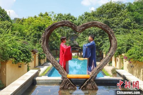 资料图: 穿汉服的夫妻游客在惠州龙门地派温泉留影 李星凯 摄