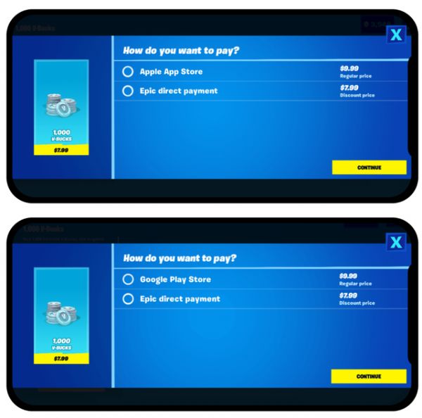 8月13日,Epic Games开始向《堡垒之夜》的iOS玩家提供绕开应用内购的直接付款方式,相比之下便宜了2美元。Epic Games介绍称,有超过一半的iOS玩家选择使用直接付款方式,而不是IAP。