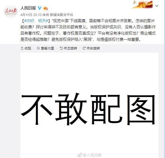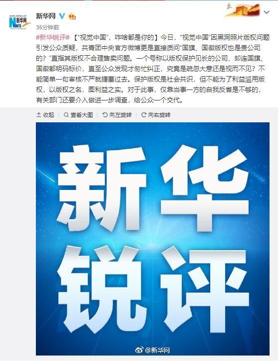 11日深夜,新华网官方微博发布“新华锐评”标签的评论,质疑视觉中国“一个号称以版权保护见长的公司,却连国旗、国徽都明码标价,直至公众发现才匆忙纠正,究竟是疏忽大意还是视而不见?”