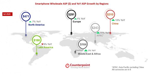 据Counterpoint报告,2020年全球智能手机平均售价除拉美地区外均有提升。