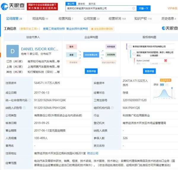 南京知行新能源汽车技术开发有限公司成立于2017年6月,注册资本约56.46亿人民币,法定代表人为Daniel Isidor Kirchert,公司经营范围包括电动汽车及零部件研发、销售、租赁、技术咨询、技术服务、技术转让;自营和代理各类商品及技术的进出口业务(国家限定企业经营或禁止进出口的商品和技术除外)。
