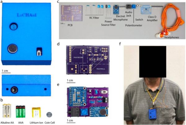 这给了 Bhamla 开发廉价设备的想法和动力,他和同事们抛弃了现代助听器使用的数字信号处理器,选择使用现成的低成本零件组装成了一副简易助听设备。首先,他们将微型麦克风焊接到一个小电路板上,用来捕获周围的声音。然后将滤波器和放大器组装进来——这个核心部件可以将频率大于 1000Hz 的声音音量放大,帮助佩戴者听清高频音。最后,用 3D 打印给它做了个外壳,装上音量控制按钮、电源开关以及耳机插孔和电池座,这个名为 LoCHAid 的助听器就完成了。