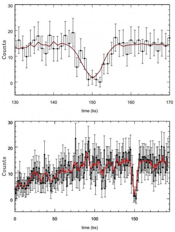 当然研究人员也意识到,除了途经的行星,还有其他因素也可能造成类似的亮度变化。例如,吸积过程自身受到扰动,从而出现亮度变化;X射线双星自身性质的变化,使得X射线源在一段时间内被关闭;或者,经过X射线源的不是行星,而是一颗体型较小的恒星(例如白矮星)。