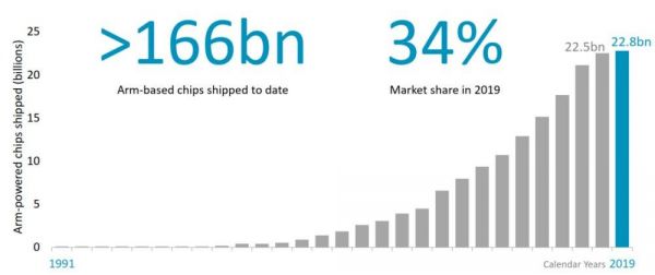不用列举眼花缭乱的财务数据,我们可以用一张图来说明ARM的牛x,根据ARM自己公布的其IP授权相关的芯片出货数据,截止到2019年,基于ARM授权的芯片出货量超过1660亿颗,占全球整个芯片市场出货量的市场份额高达34%。