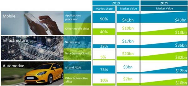 服务器仅仅是开胃菜。根据ARM自己的判断,其未来面对的市场包括移动终端、ICT基础设施、汽车、嵌入式等场景。