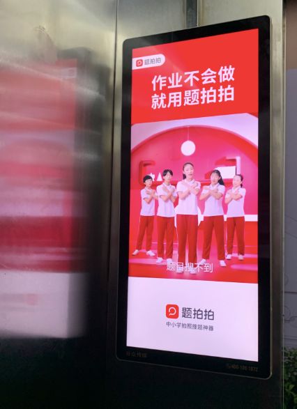 “作业不会做,就用题拍拍;题目搜不到,老师免费答!题拍拍APP”,如果说每家大班课产品都在试图用一句通俗易懂的话不断夯实在用户心中的认知,那很显然,题拍拍也试图在电梯广告里通过这点强化自身品牌效应。