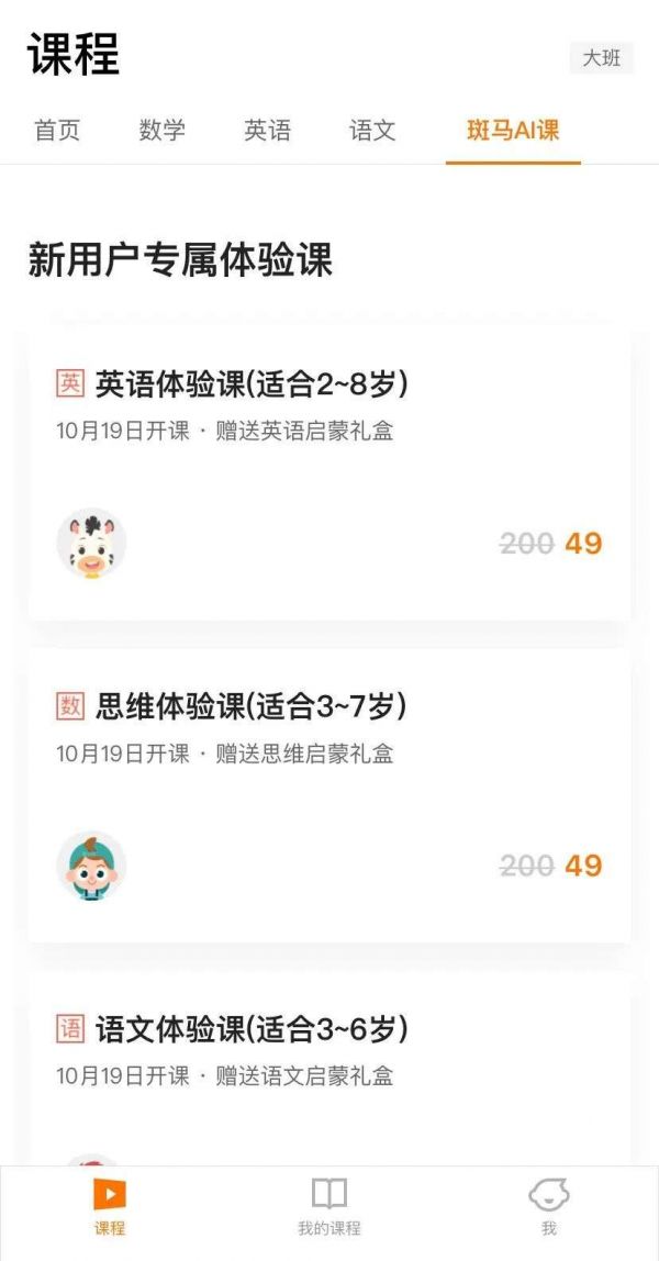 多知观察到,猿辅导APP的学段除了常规的K12之外,也涵盖了学前阶段的“大班”,当用户处于“大班”这个学段时,课程界面除了数学、语文、英语,还有很核心的一个品类,就是“斑马AI课”,而且位置明显。