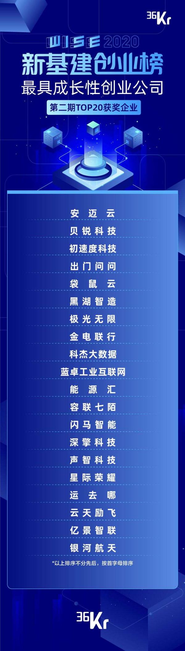 第二期「最具成长性新基建创业公司 TOP20」具体名单如下: