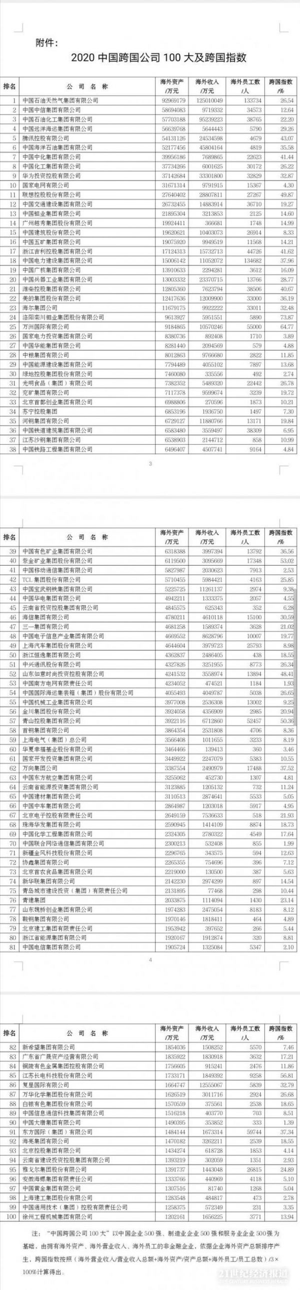 2020中国跨国公司100大跨国指数,中国石油天然气集团有限公司、中国石油化工集团有限公司、中国海洋石油集团有限公司、华为投资控股有限公司、联想控股股份有限公司、腾讯控股有限公司、中国兵器工业集团有限公司、浙江吉利控股集团有限公司、中国交通建设集团公司、复星国际有限公司位列前10位,民营企业已占到了一半。