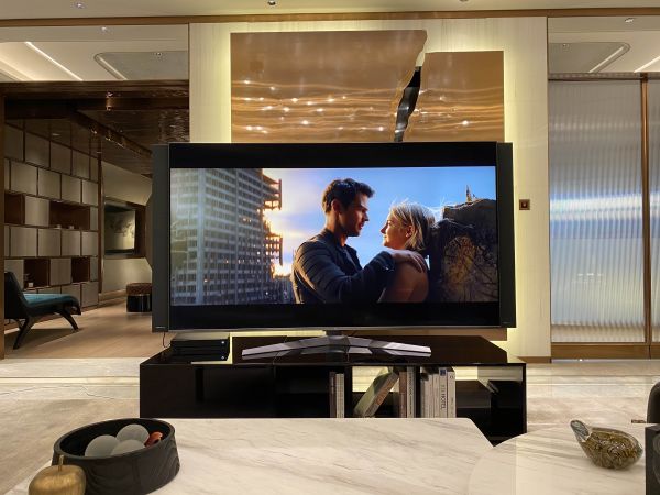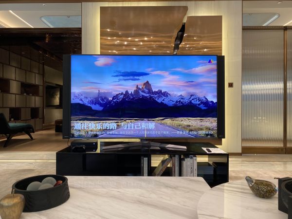 声音方面,拥有独特的自动伸缩音响,声音不再是传统的从背部发出,通过墙面发射到达观众面前,而是在正面伸出后直面观众,相当于于外置了2个独立的Sound bar,拥有8单元三分频倒相式低音增强系统,双功放电子分频,低音20瓦*2、中高频10瓦*2的硬件配置。在低音方面,2*2.5L超大腔体更能带来震撼效果,整体可以让观众感受到音画同步、扑面而来的效果体验。