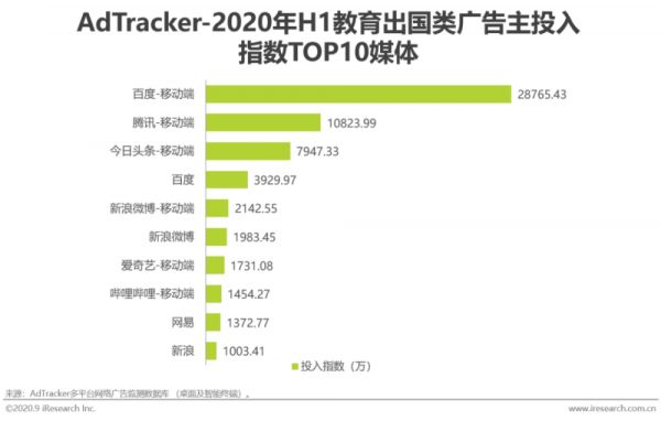 根据艾瑞的数据,在2020年1-6月中,如百度、腾讯、头条、新浪微博移动端等媒体平台吸引了教育行业企业更多的广告投入。在教育出国类广告主投入媒体排名上,百度移动端投入指数为28765.43,而头条投入指数仅为7947.33,差距仍然很大。