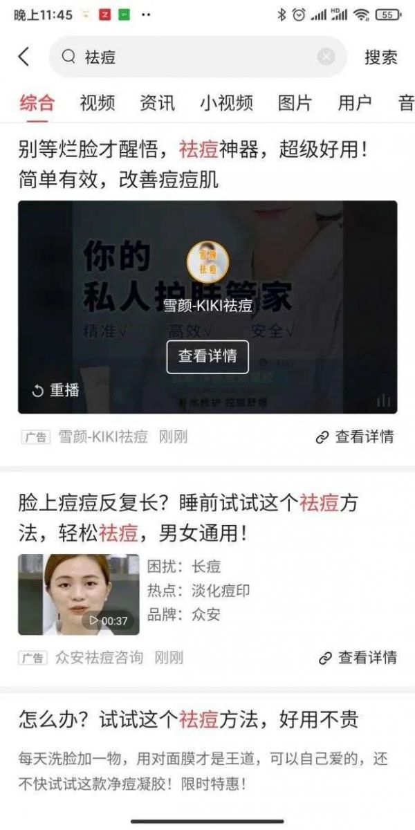 如今头条也推行竞价排名,指望它不去碰医疗美容、教育类广告的盘子,基本不可能。比如在头条上搜索“祛痘”,你会发现现在首页显示的内容和百度已经很相似。