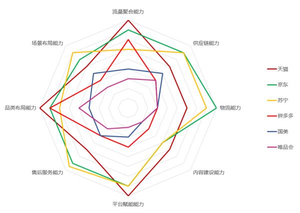 但无论零售场景如何变,不管流量如何充沛,技术如何迭代,最终行业比拼的仍是服务。这也是过去30年中,苏宁总结出的最核心经验法则。因此在咨询机构调研得出的“电商平台多面能力图”中可以看到,苏宁、京东等自营型电商则在供应链、物流、售后服务等方面能力更优秀。