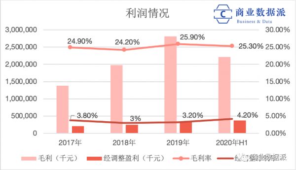 在这种背景下,京东健康近年来的利润水平算是表现不错。京东健康的经调整净利润率一直都在稳步上升,从2018年的3%,到2020年上半年达到4.2%;毛利率的水平也不错,从2019年以来,一直稳定在25%以上,在2020年上半年达到25.3%。