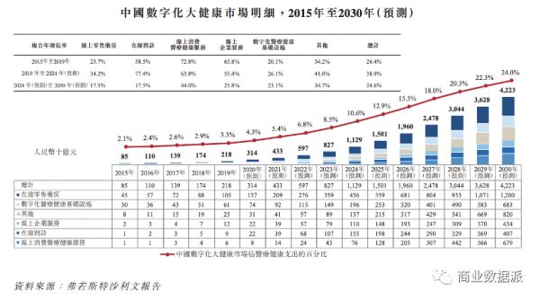 根据弗若斯特沙利文报告,2024年及2030年,中国大健康市场的数字比重预计将由2019年的3.3%分别快速增至中国医疗健康总支出的10.6%和24%。