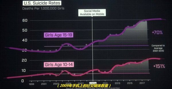 纪录片截图:近20年,美国每年少女因手机上瘾而自残与自杀的趋势
