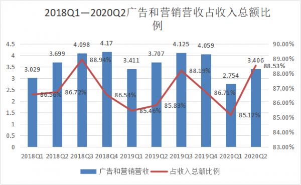 微博Q2广告和营销营收为3.406亿美元,同比下降8%,这个表现尚算及格。但以更长的时间尺度来看,占到营收接近九成的广告和营销业务,过去九个季度表现一般,几乎没有迎来一个较大的增长,这是微博近两年股价低迷的一个重要因素。