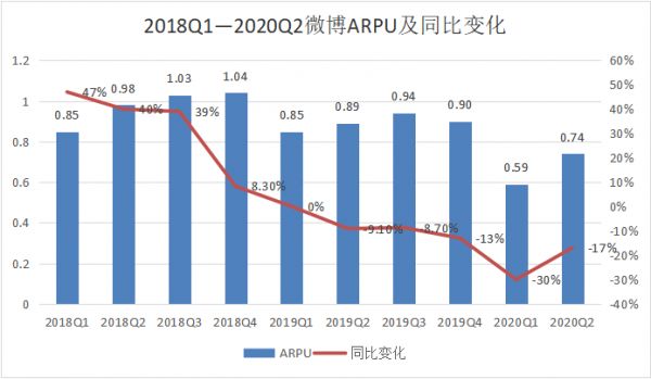 从各个平台的ARPU(每用户平均收入)值上也能看到,微博虽坐拥5亿用户,可单个用户贡献的收入其实并不高。Q2季度微博净营收为3.874亿美元,截止6月的月活跃用户数为5.23亿,ARPU只有0.74美元。据中信证券的研究报告测算,2019年字节跳动全球广告ARPU接近10美元,国内ARPU可达20美元。