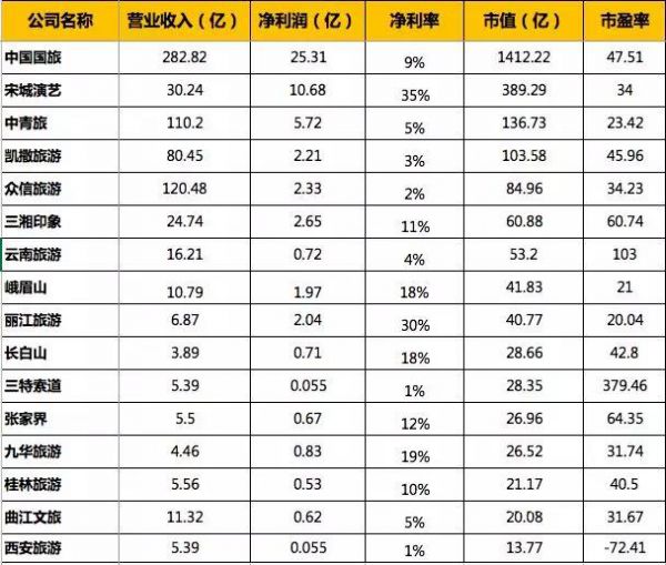 参照其他行业的情况,我们暂且把营收超过100亿,市值超过1000亿的公司称之为巨头,目前A股旅游类上市公司的现状,只有中国国旅一家达到了这个标准,其他除了几个旅行社业务为主的企业,景区类企业无论是营收还是市值,都处于一个很低的水平,可谓“万马齐喑”。(《万亿规模的旅游行业为什么没有巨头?》张永佳,2017年)