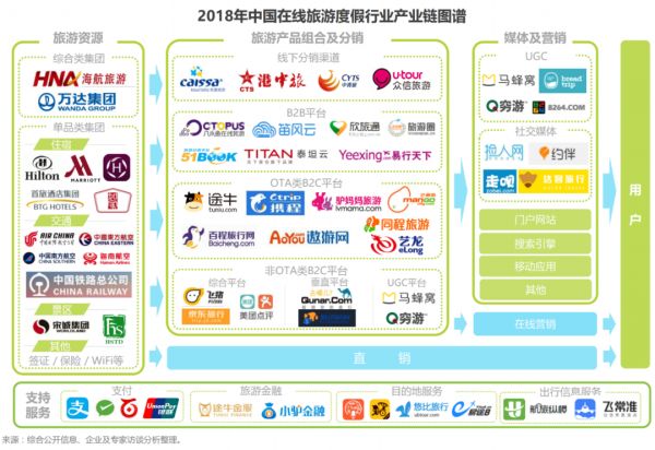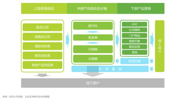 在线旅游产业链,大致可分为三个部分,分别是上游资源供应,中游产品组合及分销,下游产品营销。上游资源供应又可分为航空公司、铁路总公司、酒店供应商、景区供应商和其他产品供应商;中游产品组合及分销,则分为旅行社-批发商-代理商和分销商;下游产品营销,则包括了UGC、社交媒体、门户网站、搜索引擎、移动应用和其他。