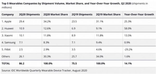 IDC关于2020年第二季度可穿戴设备的市场调查数据