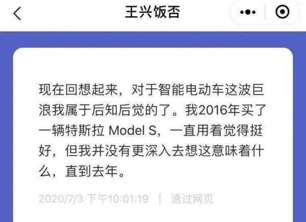 而这一切的变化,忙于美团增长的王兴或许并没有察觉到,正如他在今年7月在饭否中这样写道“我2016年买了辆特斯拉Model S,一直用着觉得挺好,但我并没有更深入去想这意味着什么,直到去年。”