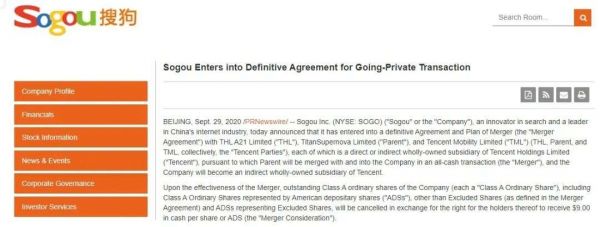 据外媒报道,搜狗股票将以每股或每ADS(美国存托股)9美元被注销,比搜狗在9月29日的收市价8.87美元稍高。预计交易将在2020年第四季度完成,交易完成后,搜狗将从纽交所退市。