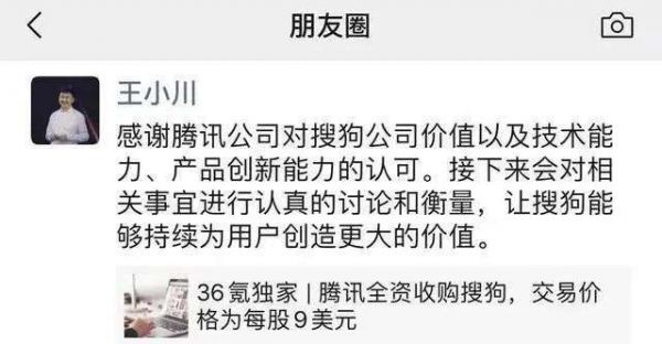 当腾讯于7月提出收购要约时,王小川一改之前的态度,在朋友圈回应:“感谢腾讯公司对搜狗公司价值以及技术能力产品创新能力的认可。接下来会对相关事宜进行认真的讨论和衡量,让搜狗能够持续为用户创造更大的价值。”
