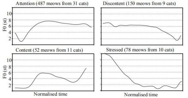 她发现:猫在开心与满足时,倾向于发出频率上升的叫声;而在情绪低落或者感到紧张时,发出的喵声呈现下降频率。
