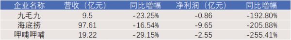 不仅九毛九,上半年国内餐饮企业普遍亏损严重。据联商网数据研究中心统计,已经公布2020年上半年业绩的15家餐饮上市企业共实现营收437.3亿元,亏损5.69亿元。其中,共有13家出现营收净利双双暴跌,包括百胜中国、海底捞、呷哺呷哺、九毛九等餐饮巨头以及全聚德、同庆楼等老字号。