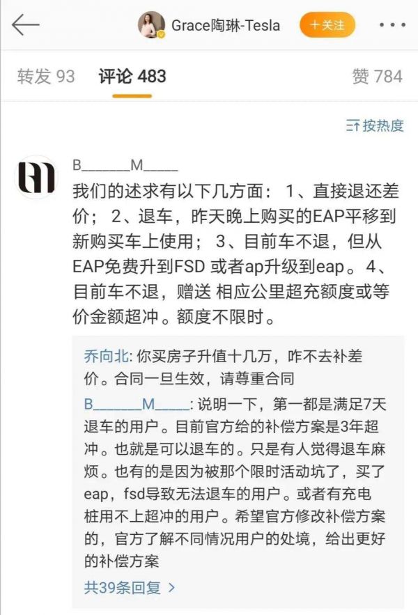 已经有不少车主冲到特斯拉副总裁陶琳的官微留言提出诉求:“ 1、直接退还差价;2、退车,昨天晚上购买的EAP(增强辅助驾驶系统)平移到新购买车上使用;3、目前车不退,但从EAP免费升到FSD(完全自动驾驶套件),或者AP(没有Autopilot辅助驾驶功能)升级到EAP。4、目前车不退,赠送相应公里超充额度或等价金额超冲,额度不限时。”