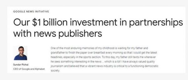 皮查伊在一篇博客文章中表示:“这一项目承诺将向出版商支付费用,这也是我们迄今为止最大的一笔财政项目,可以为不同的在线新闻服务创建及策划高质量的内容。”