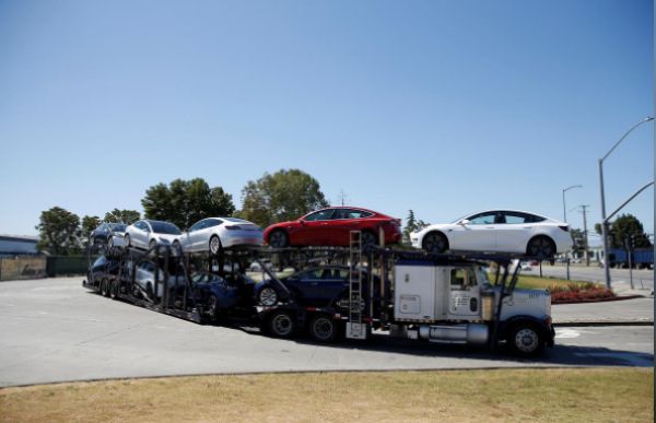 (2018年6月22日,一辆载着特斯拉Model 3电动轿车的汽车拖车,出现在美国加利福尼亚州弗里蒙特的特斯拉工厂外。)