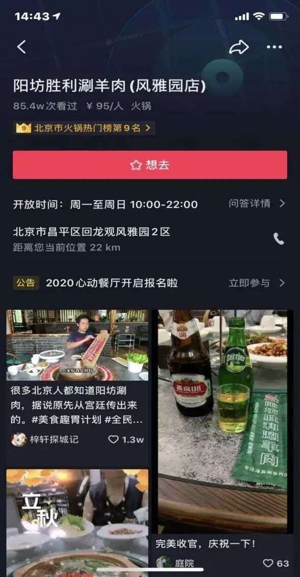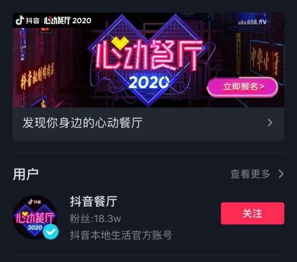 9月初,抖音上线了“抖音心动餐厅”,通过视频直播的方式发掘国内最受欢迎的餐馆。抖音用户通过实拍餐厅视频,发布时携带餐厅定位及活动话题即可提名。截至目前,抖音话题榜“抖音心动餐厅”的播放量已经超21亿次。