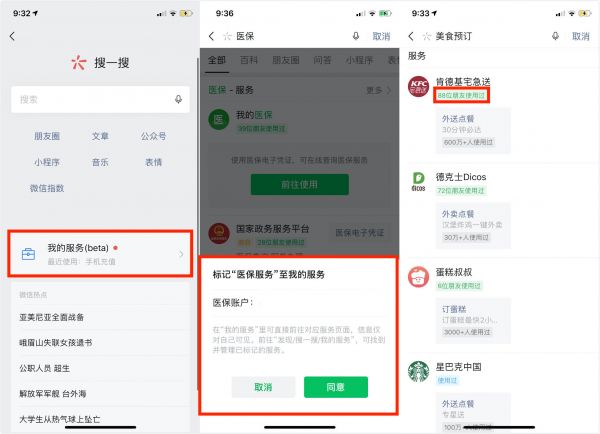 “我的服务”搜索入口,用户需进行主动标记。搜索服务会显示“多少位朋友使用过”。