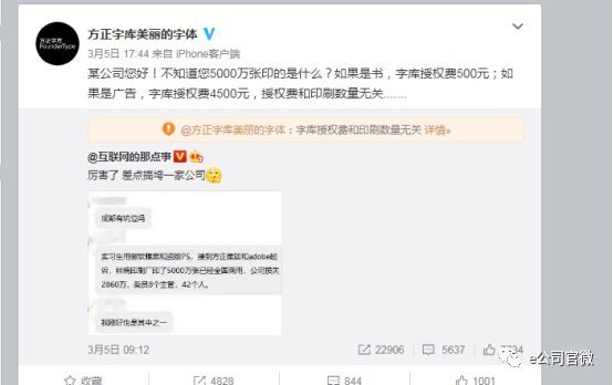 今年3月,一条微博传言更是将方正的字体维权送上了热搜。截图显示,一名公司实习生用微软雅黑和盗版PS,被方正集团和adobe起诉。样稿印刷厂印了5000张已全国商用,公司损失了2860万,裁员8个主管43人。
