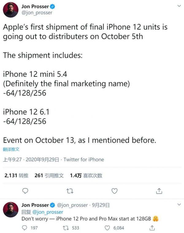 消息中指出,iPhone 12系列将从10月5日开始向全球各地经销商发货,搭载5.4英寸屏幕的iPhone 12 mini有64GB/128GB/256GB三种存储规格可选,搭载6.1英寸屏幕的iPhone 12的存储规格同上。