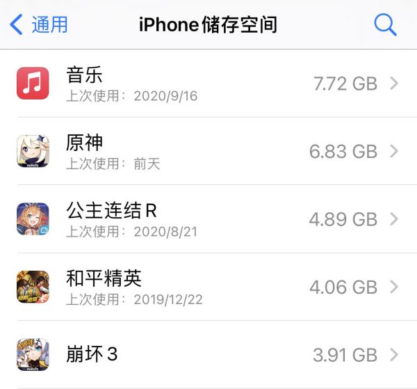 以近期刚上线的《原神》为例,登陆移动端之前已经去除了大量高精度美术资源,但在iOS设备安装后仍要占用将近7GB空间。已经上线有些时日手游也没有例外太多,长期占据榜单前列的《王者荣耀》《和平精英》,最新的iOS版所需空间分别是5GB和4GB。
