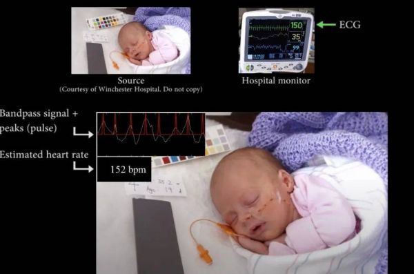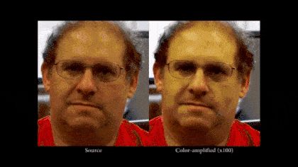 因心跳产生的皮肤颜色变化,在人脸上同样会出现,只是极其微弱,对肉眼不可见,在视频里就更难看出来了。不过对视频进行特定处理,增强颜色变化的效果,肉眼就可以很明显地观察出来了: